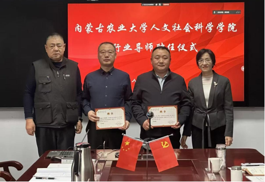 会议由人文社会科学学院副院长刘贺贺主持。会议开始,学院书记李金华和院长张银花为获聘2026年内蒙古农业大学校企(地)联合培养实践基地硕士研究生指导教师并出席本次会议的两位老师颁发聘任证书。