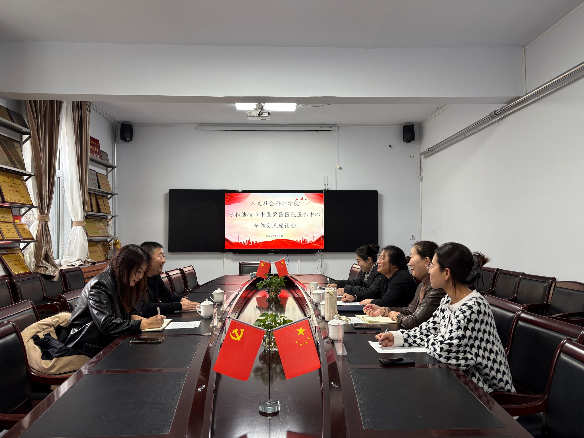2026年1月9日下午,呼和浩特市中医蒙医医院医养中心杨海龙主任、乌日格模乐副主任一行莅临我院,于人文院一楼会议室开展“访企拓岗”合作交流座谈会。学院党委副书记王丽主持,出席会议的有:学校乡村振兴研究院副院长闫文彬、社会工作教研室伊丽娜老师,张秉洁老师、学院就业工作负责人陈玉双。双方围绕人才培养、学生实践、志愿服务及岗位拓展等议题进行了深入探讨。